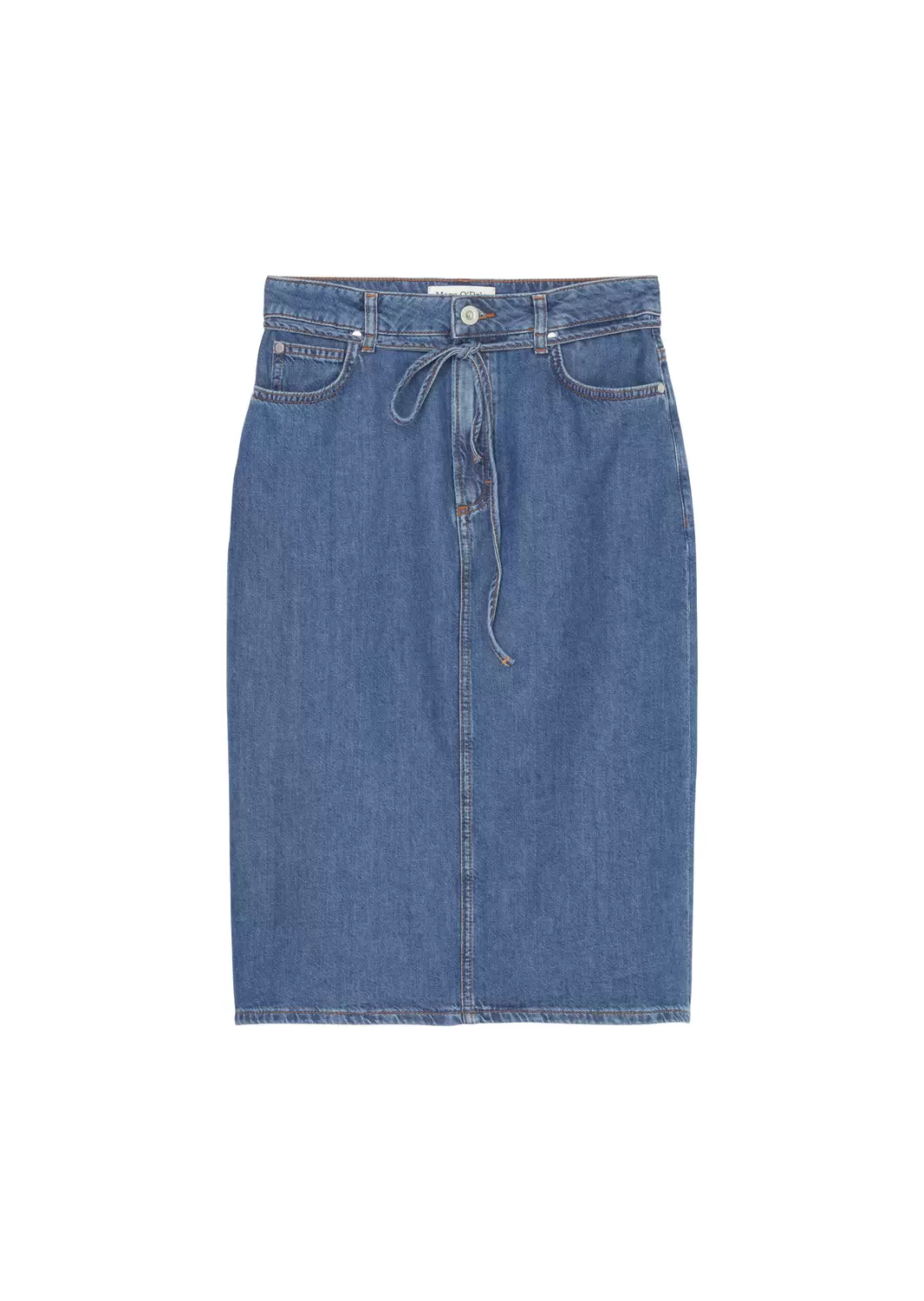 So lässig kann der 90ies inspirierte Retro-Jeans-Trend aussehen: nostalgisch angehauchter Jeansrock in Midilänge. Leicht ausgestelltes Modell mit hoher Taille aus leichtem, hochwertigem Organic Cotton-Lyocell-Mix. Five-Pocket-Modell mit runden Eingrifftaschen vorne und aufgesetzten hinten. Neu: der schmale, abnehmbare Bindegürtel am Bund. In authentischer, blauer Waschung und charakteristischen, kontrastfarbenen Nähten. Styling-Tipp: mit dem passenden Denim-Shirt kombinieren.