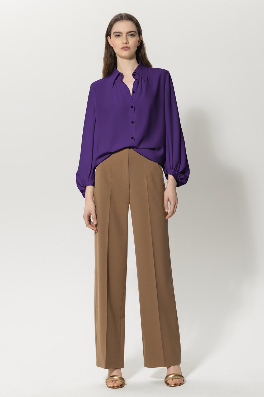 Schlichte Hose aus weicher Techno-Wolle mit weitem Bein und Bügelfalten. Die Hose hat zwei Seitentaschen sowie zwei angedeutete Pattentaschen.