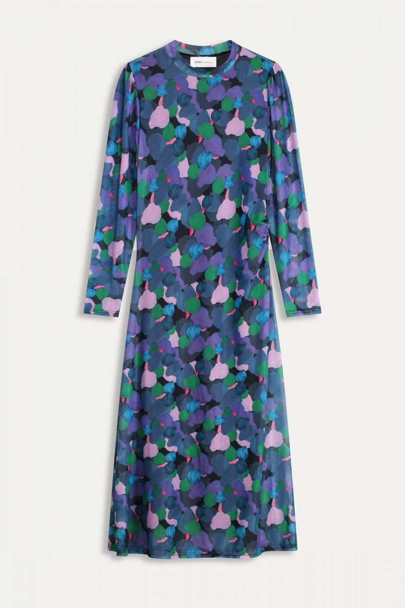 Das Brushwork Lilac Slim ist ein farbenfrohes Maxikleid. Der Druck des Kleides ist den Pinselstrichen eines Pinsels nachempfunden und zeigt verschiedene Blau-, Grün- und Lilatöne. Das Kleid fällt bis knapp über die Knöchel und hat lange Ärmel. Die Ärmel und der Ausschnitt des Kleides sind halbtransparent. Wegen des schwarzen Futters ist das Kleid blickdicht. Die Taille des Kleides ist mit einem Gummizug versehen, der die Taille leicht akzentuiert. Durch die Falten an den Schultern entstehen sehr dezente Puffärmel. Kombiniere das Kleid mit einem schönen Paar Abssatzschuhen oder hohen Stiefeln für einen stilvollen Look! Passform: Das Kleid ist eng anliegend geschnitten und ist an der Taille leicht tailliert und die Länge liegt auf der Wade. Das Model ist 172 cm groß und trägt die Größe 36.